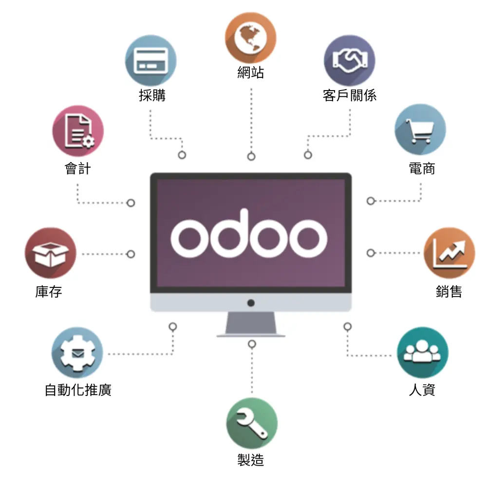 - 核心業務流程:例如,銷售管理 (Sales)、庫存管理 (Inventory)、採購 (Purchase)、會計 (Accounting)、客戶關係管理 (CRM)。